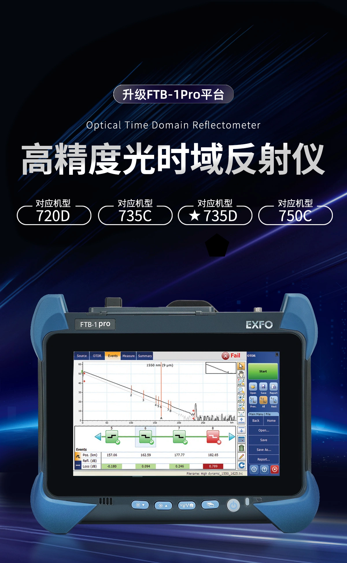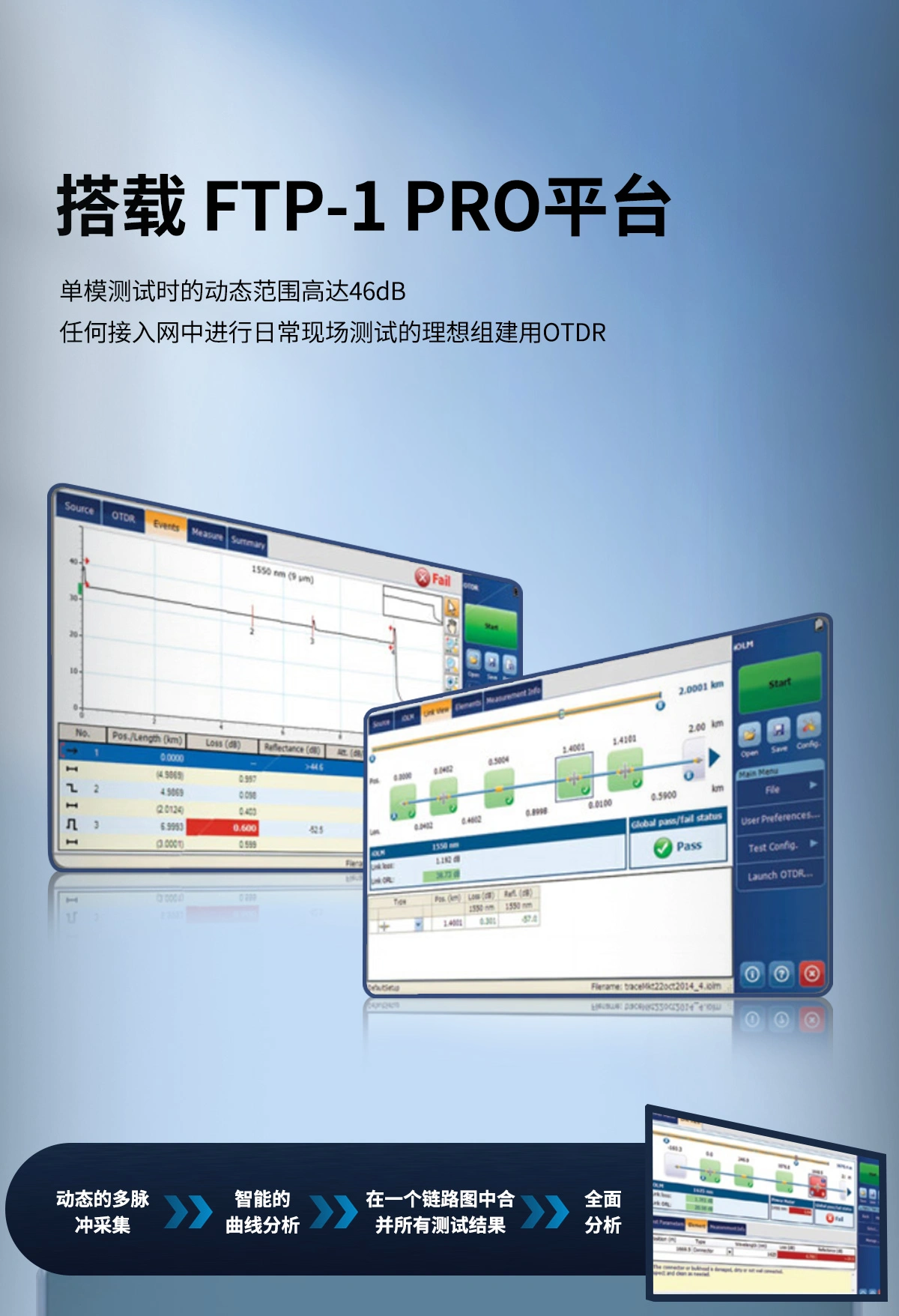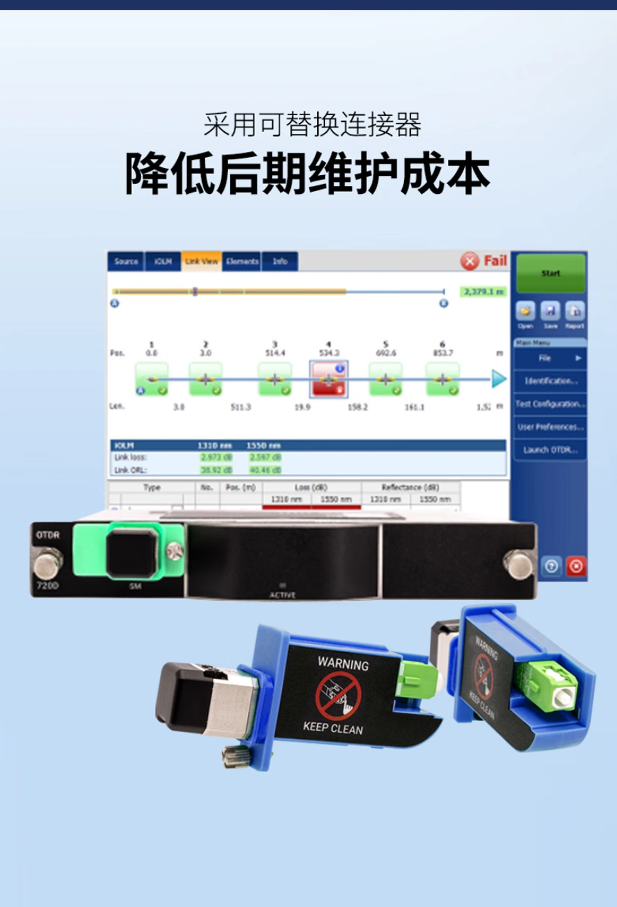 凭借可达36dB的动态范围、0.8m的事件盲区和3m的衰减盲区,FTB-720C使您能够轻松定位并鉴定发射器和中心局光纤盒之间的所有事件。