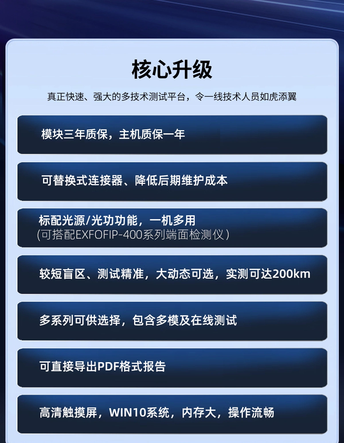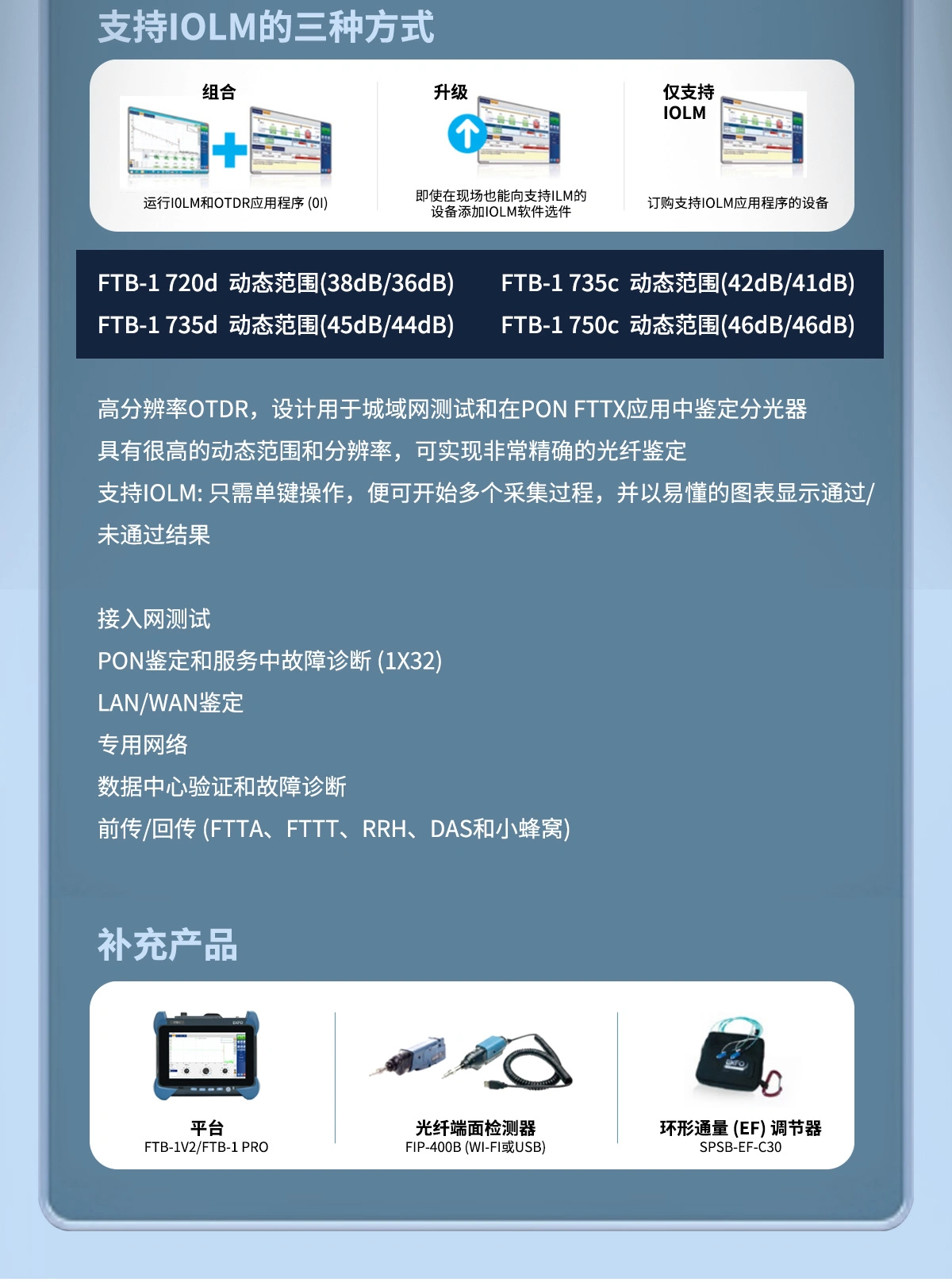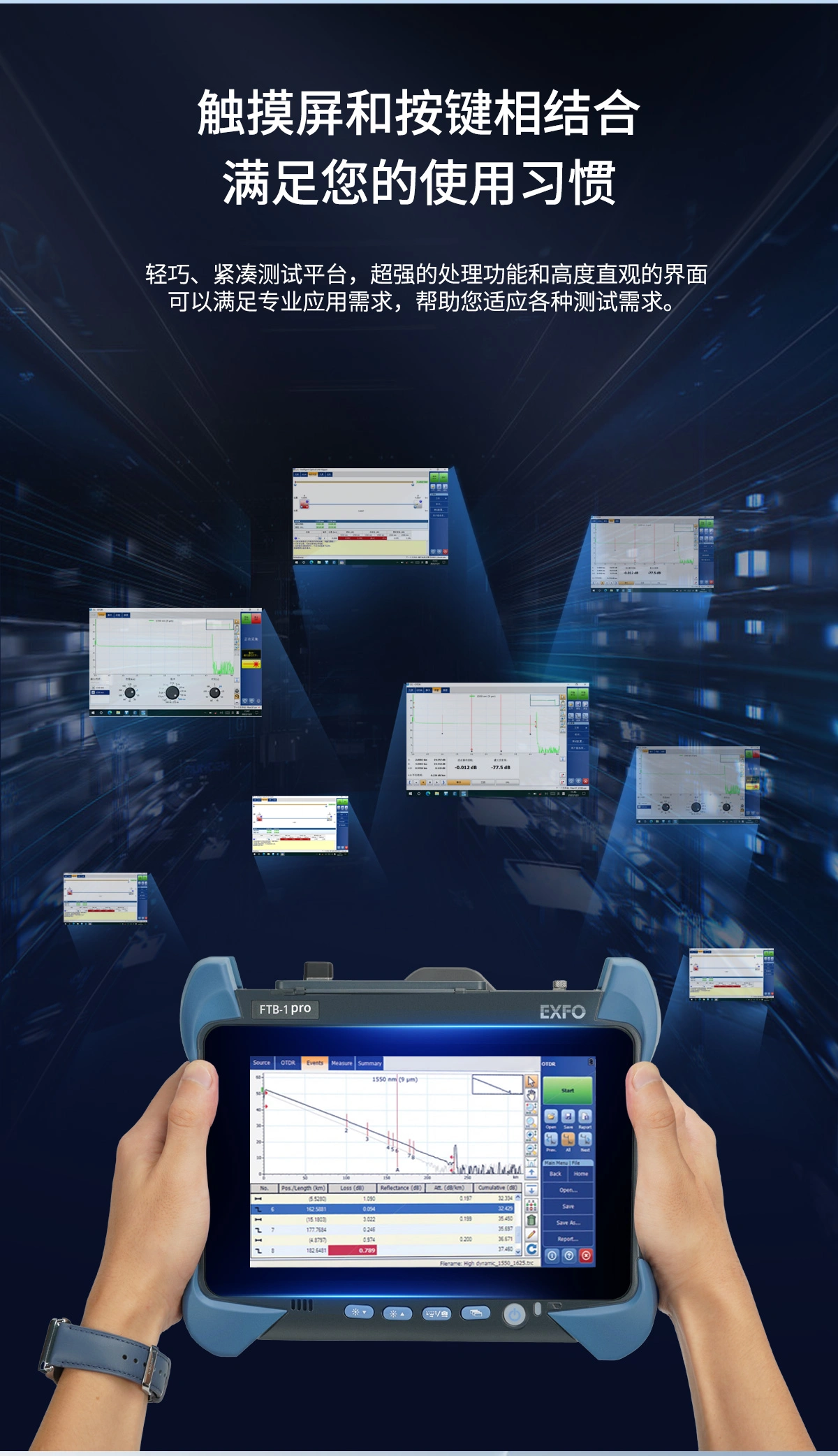 凭借可达36dB的动态范围、0.8m的事件盲区和3m的衰减盲区,FTB-720C使您能够轻松定位并鉴定发射器和中心局光纤盒之间的所有事件。
