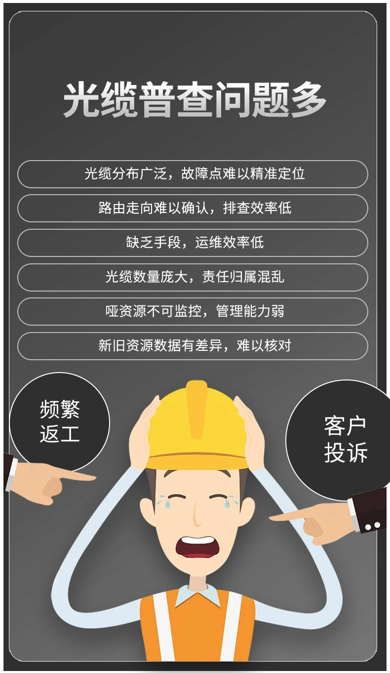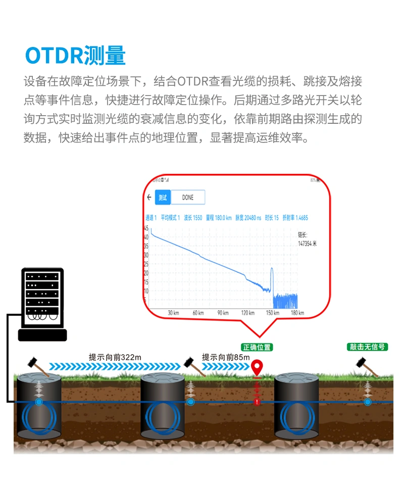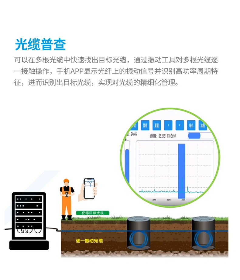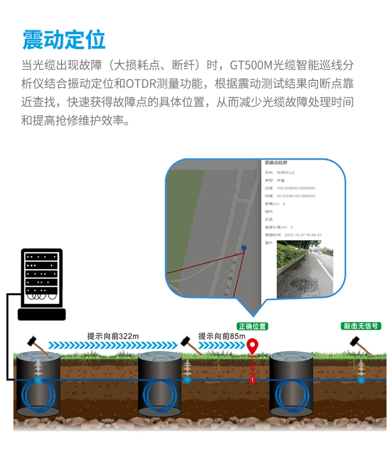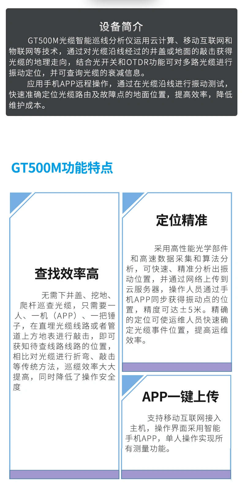 GT500M光缆智能巡线分析仪运用云计算、移动互联网和物联网等技术,通过对光缆沿线经过的井盖或地面的敲击获得光缆的地理走向,结合光开关和OTDR功能可对多路光缆进行振动定位,并可查询光缆的衰减信息。应用手机APP远程操作,通过在光缆沿线进行振动测试,快速准确定位光缆路由及故障点的地面位置,提高效率,降低维护成本。