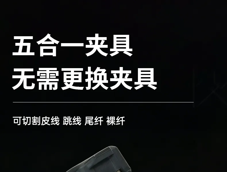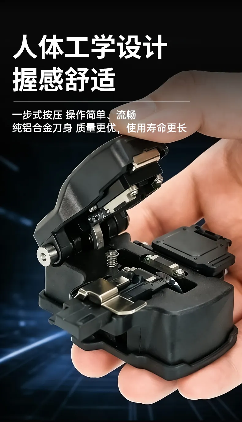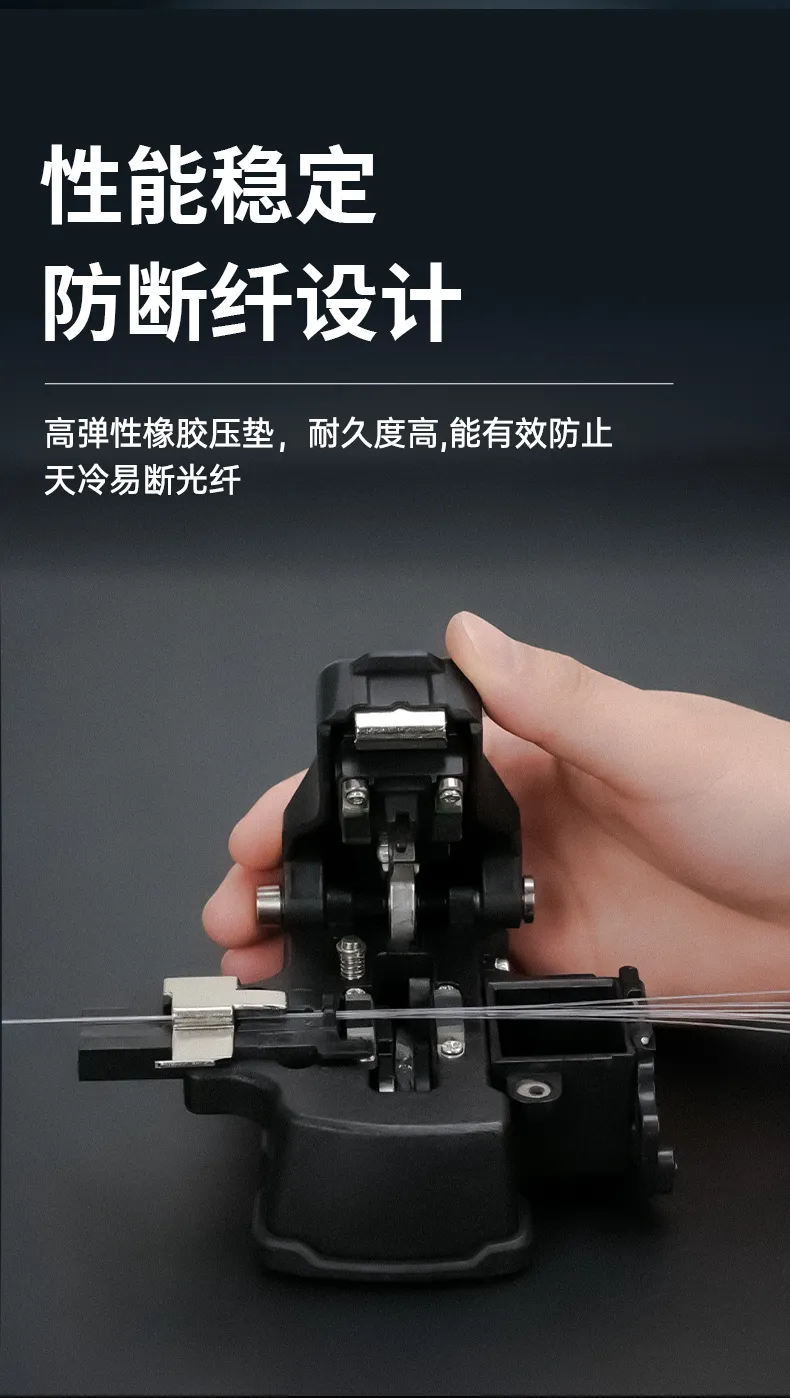 一步式按压设计/纯铝合金刀身/人体工学设计,高弹性橡胶压垫,耐久度高,能有效防止天冷易断光纤,五合一夹具无需更换夹具。