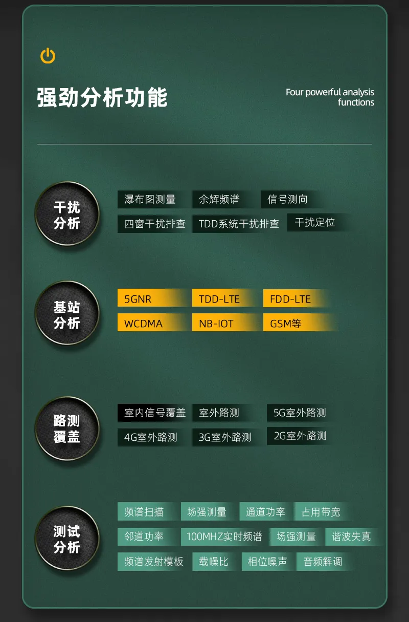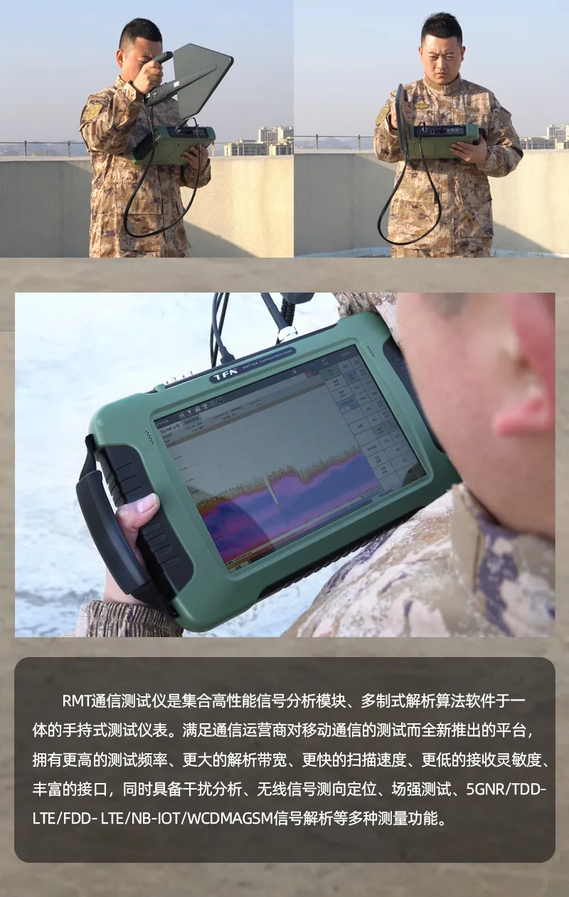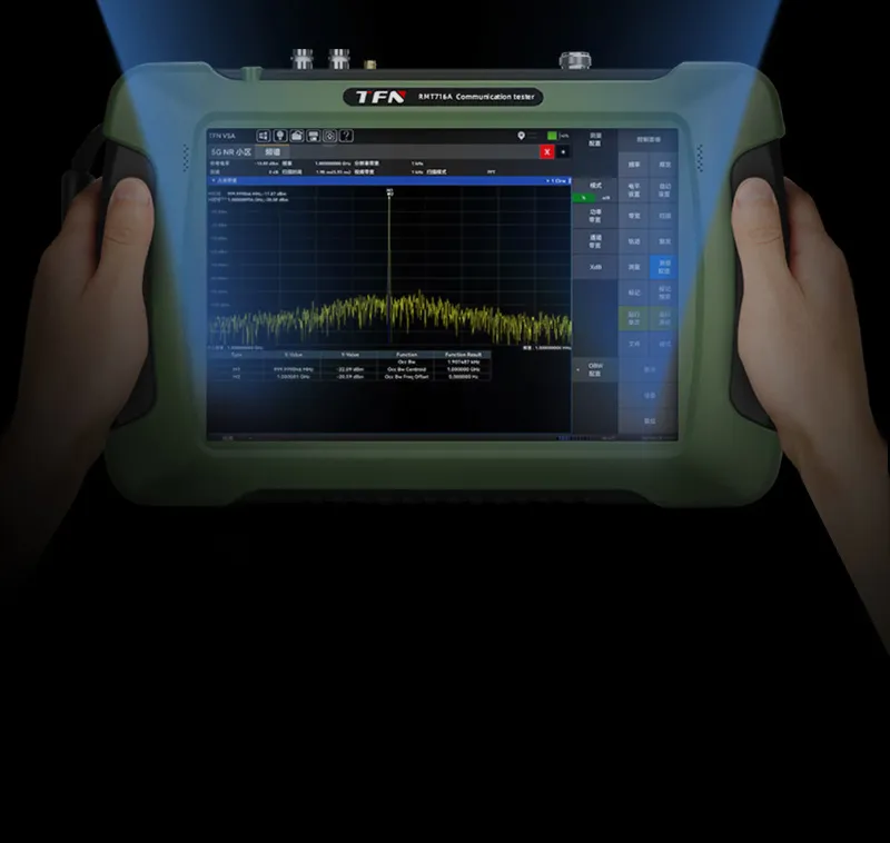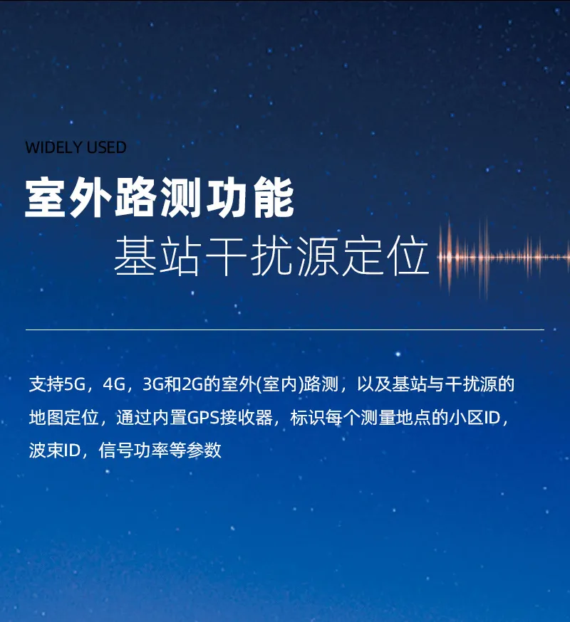 5KHz-6.32GHz测试频率范围,具备干扰分析、无线信号测向定位、场强测试、5GNR/TDD-LTE/FDD-LTE/NB-IOT/WCDMA/GSM信号解析等多种测量功能;10.5英寸电容触摸屏,体积小、重量轻、供电灵活、支持云操控,适合外场基站测试与部署。