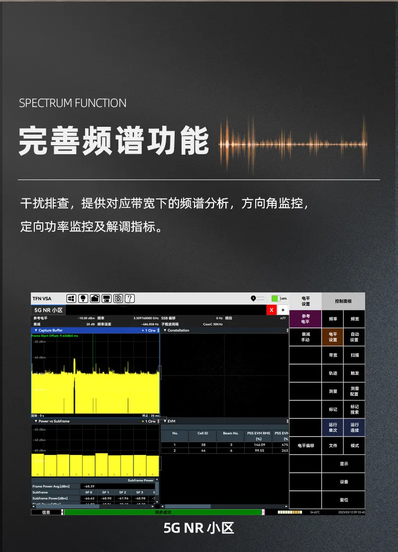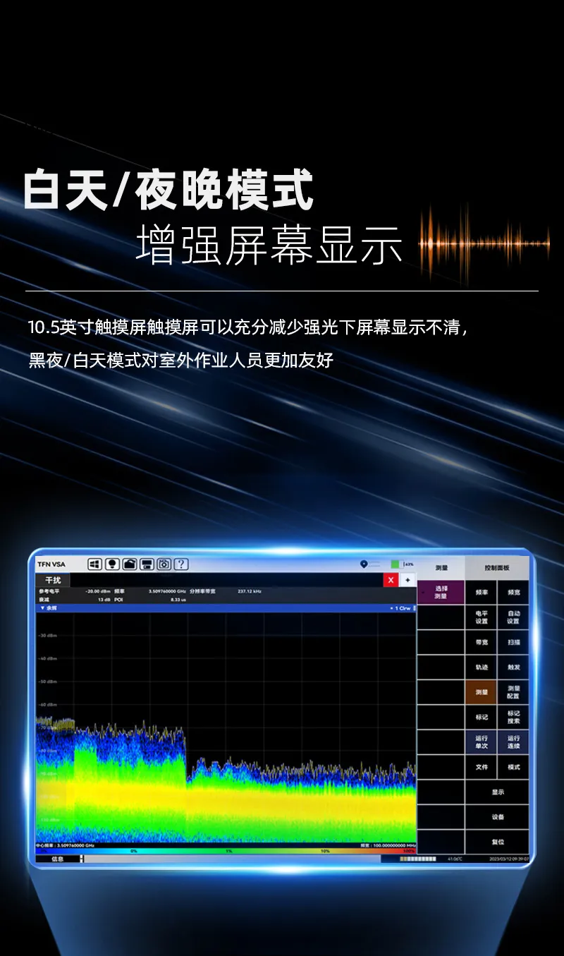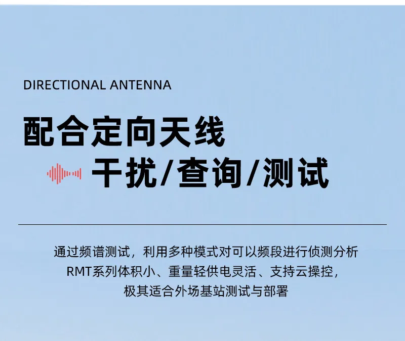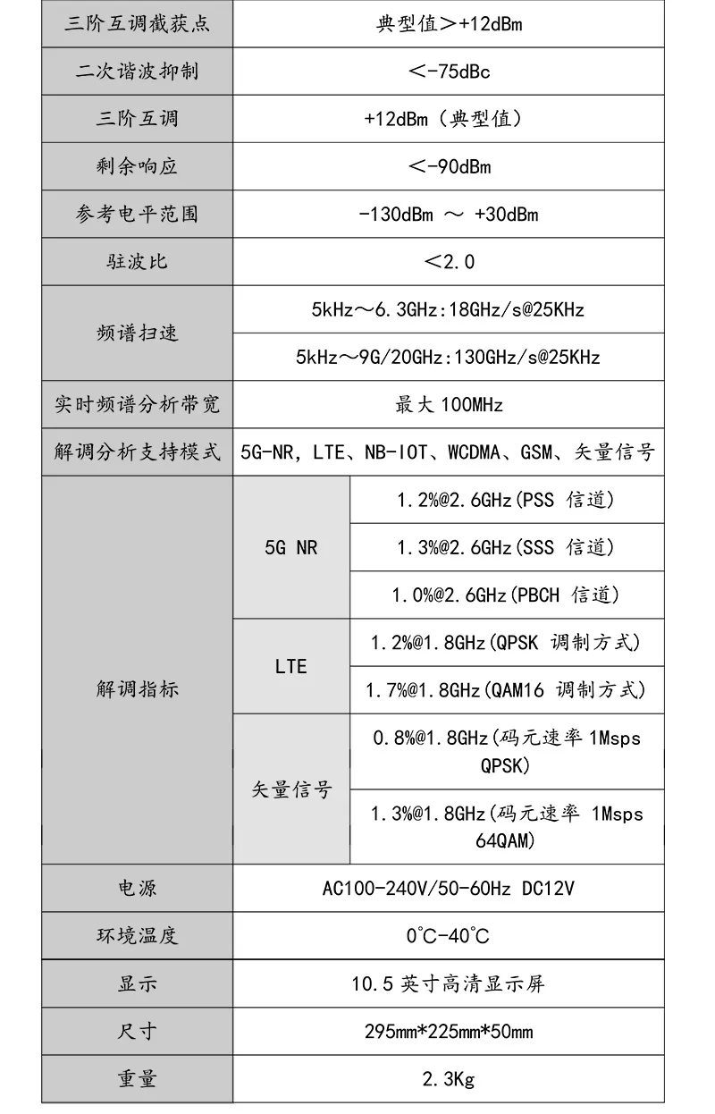 5KHz-6.32GHz测试频率范围,具备干扰分析、无线信号测向定位、场强测试、5GNR/TDD-LTE/FDD-LTE/NB-IOT/WCDMA/GSM信号解析等多种测量功能;10.5英寸电容触摸屏,体积小、重量轻、供电灵活、支持云操控,适合外场基站测试与部署。