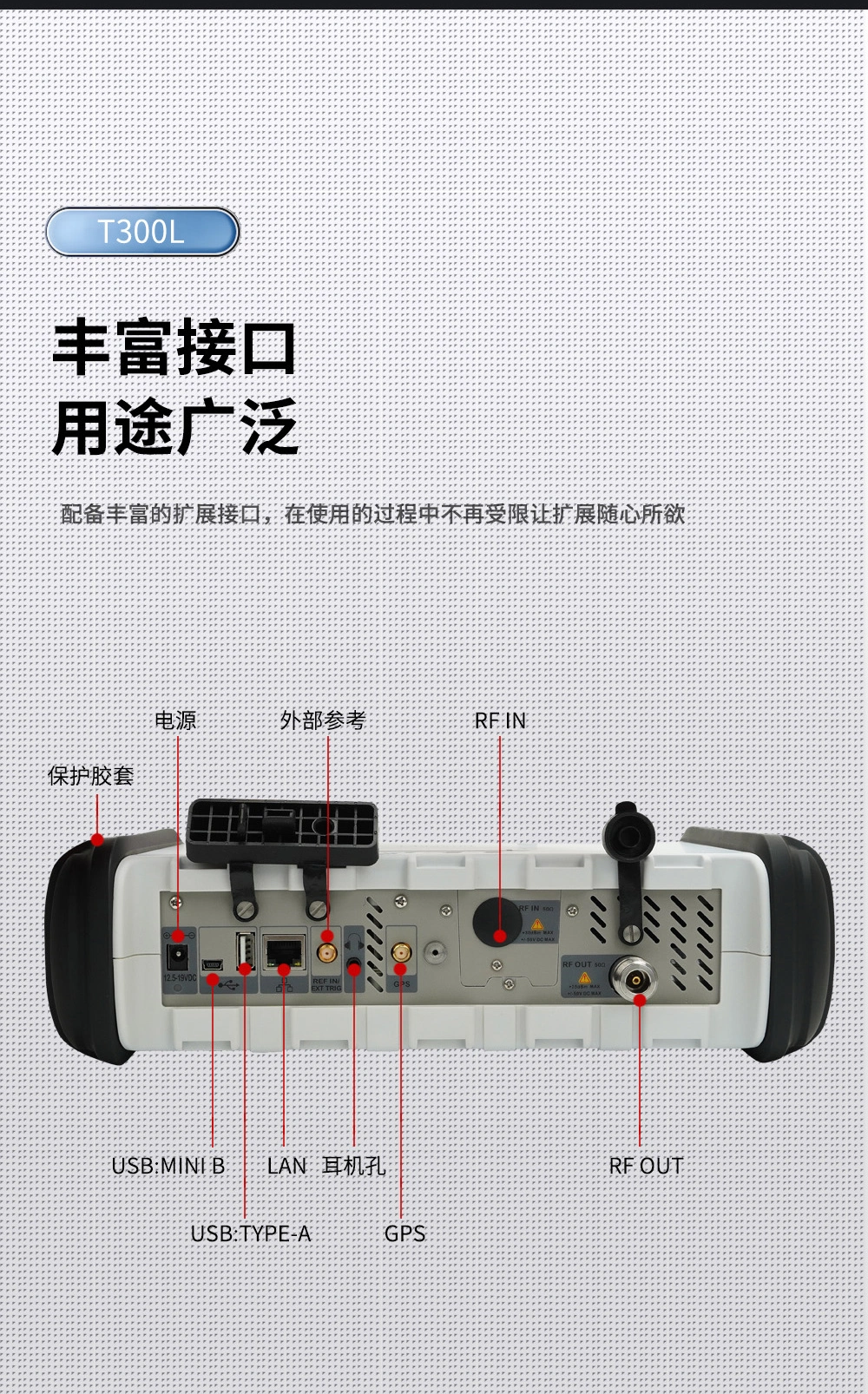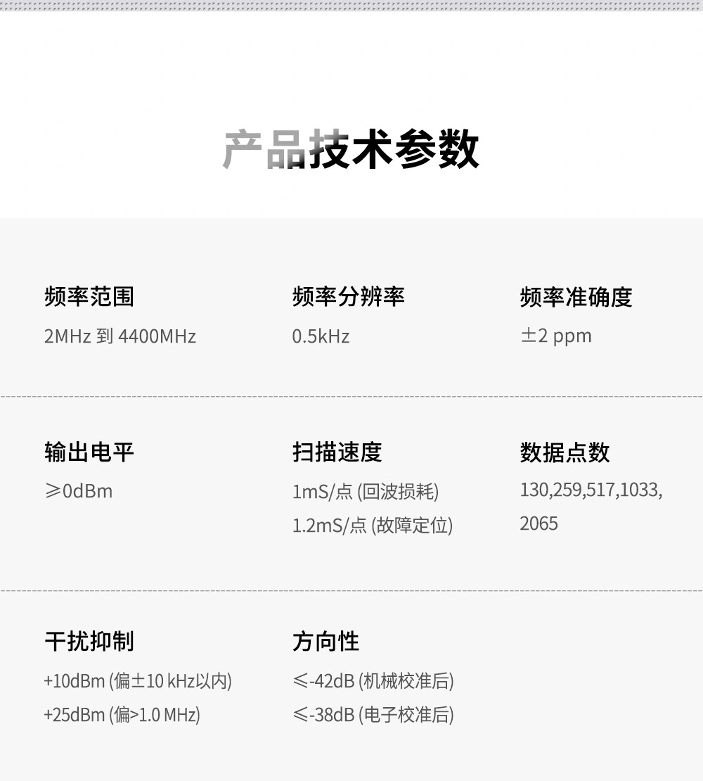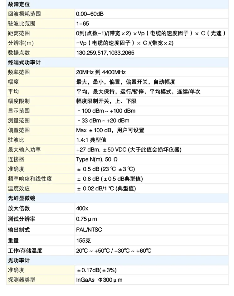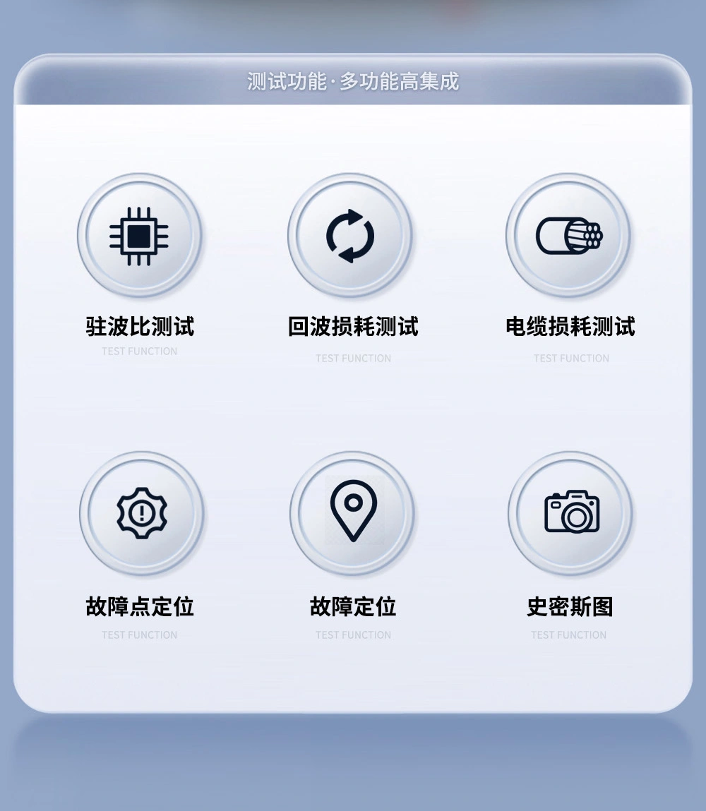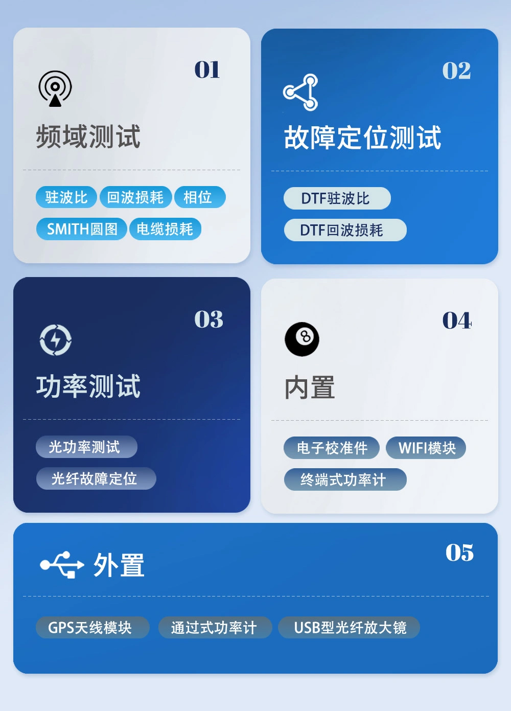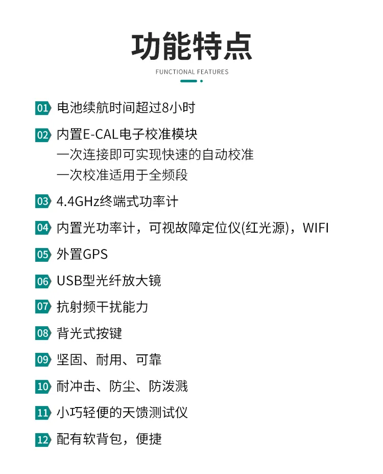 频率范围:2MHz~4400MHz,主要有频域测试、故障定位测试、功率测试等功能,内置E-CAL电子校准模块,4.4GHz终端式功率计等,外置GPS天线模块、通过式功率计等。适用于无线通信运营商和无线信号覆盖安装、维护工程承包商、科研、教学、生产等领域。