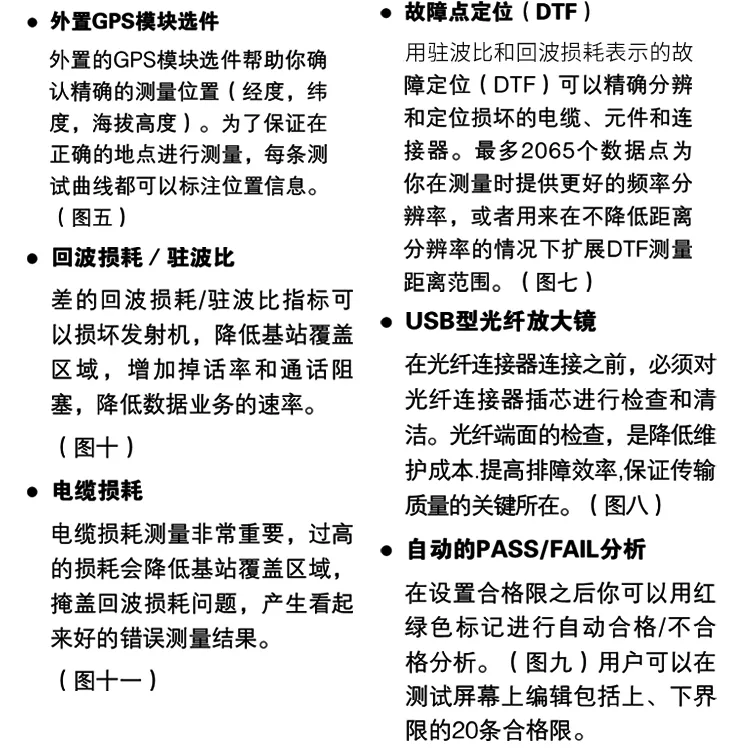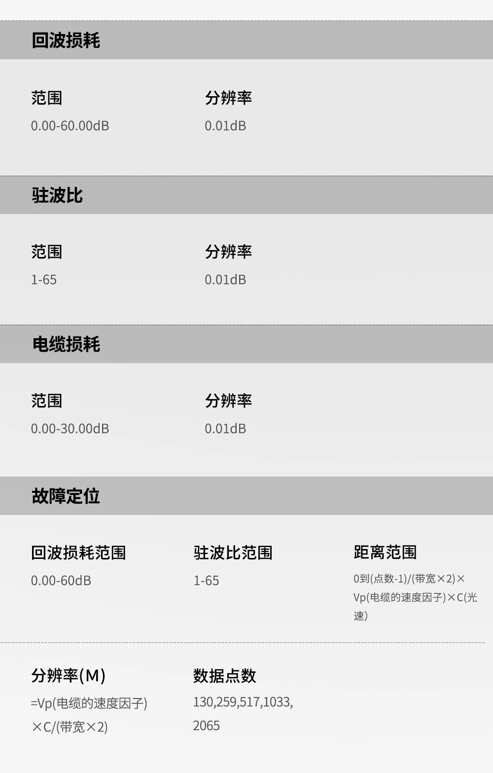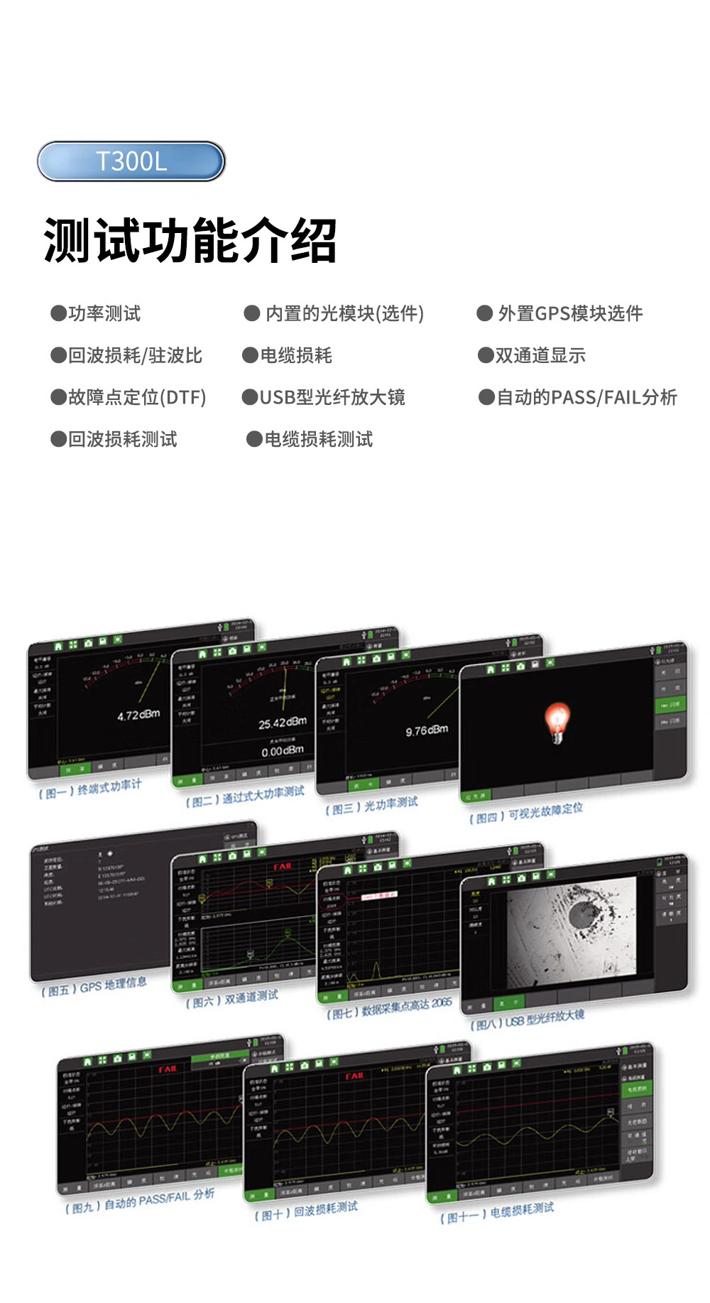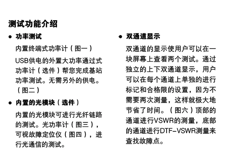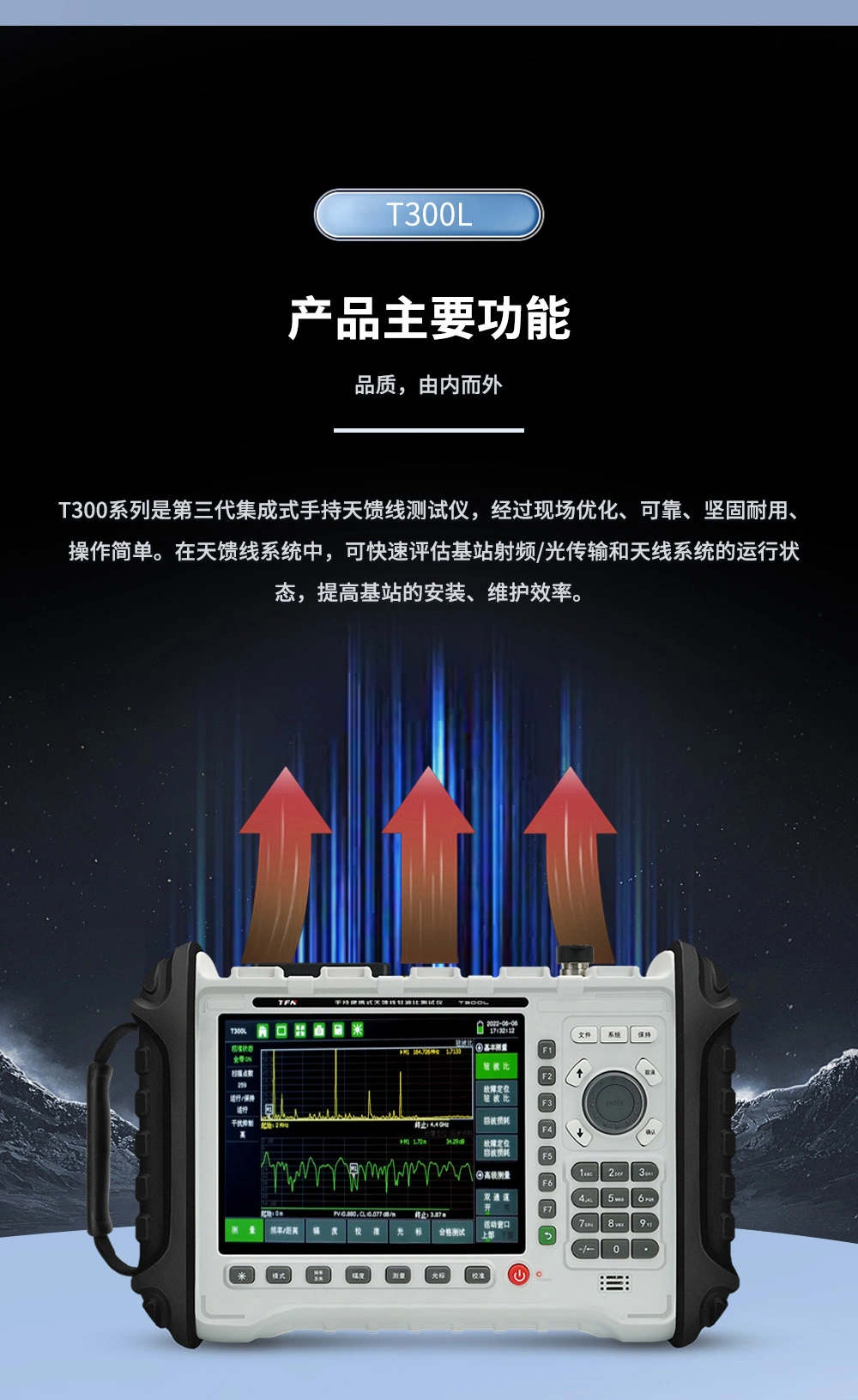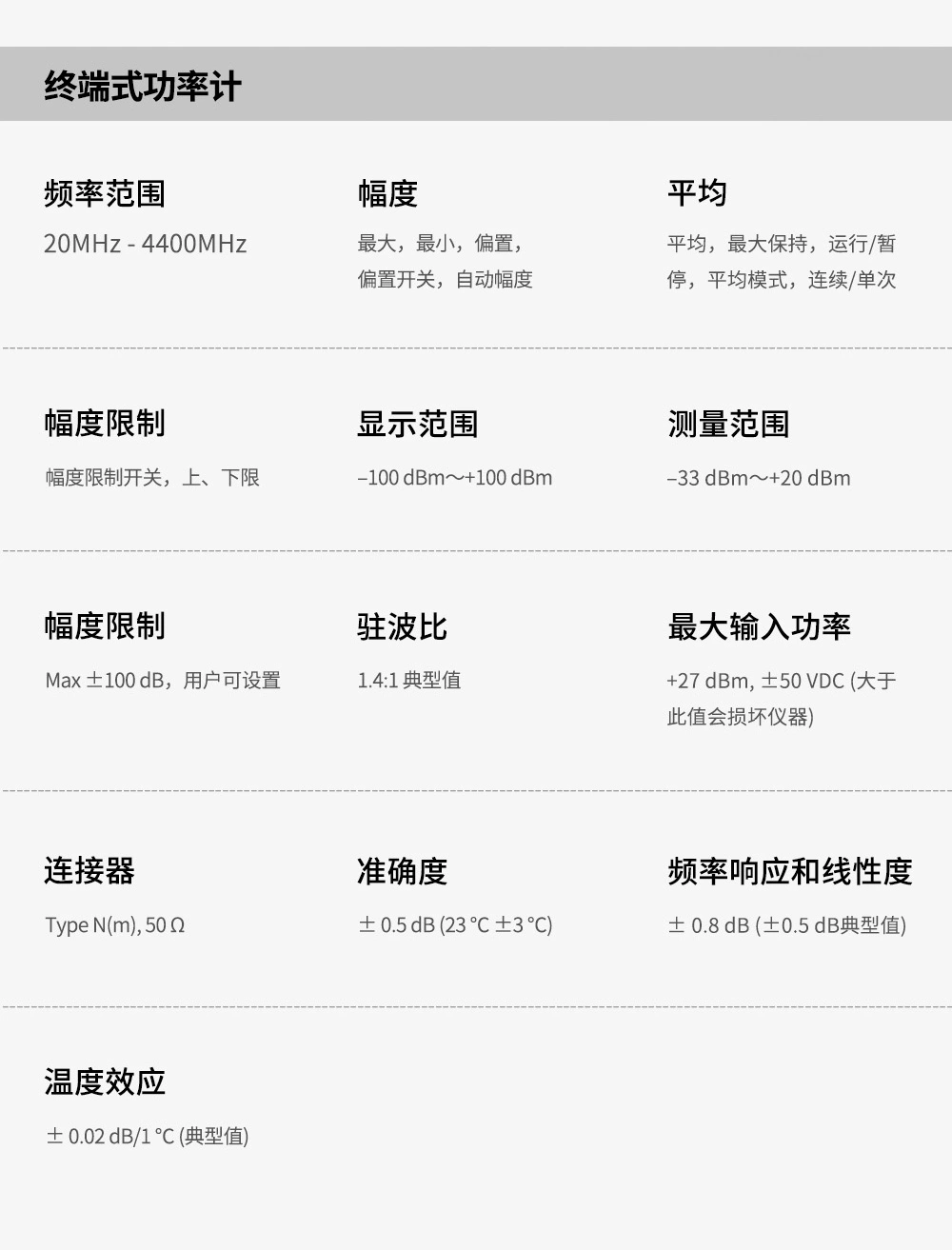 频率范围:2MHz~4400MHz,主要有频域测试、故障定位测试、功率测试等功能,内置E-CAL电子校准模块,4.4GHz终端式功率计等,外置GPS天线模块、通过式功率计等。适用于无线通信运营商和无线信号覆盖安装、维护工程承包商、科研、教学、生产等领域。